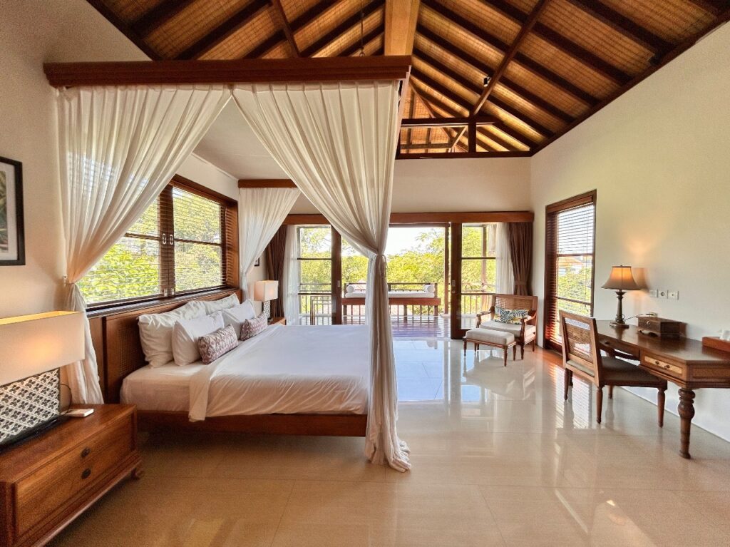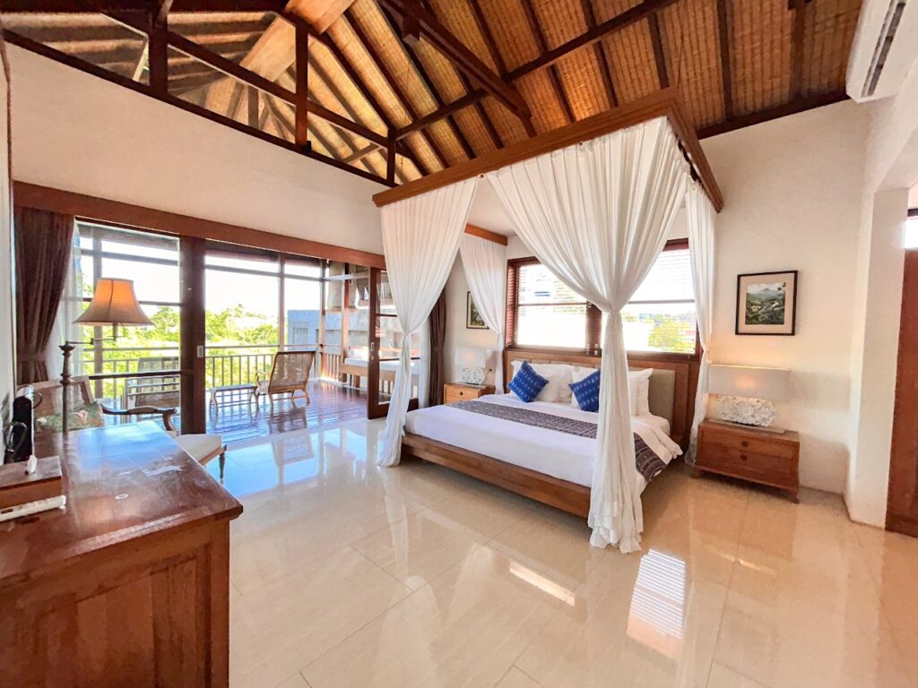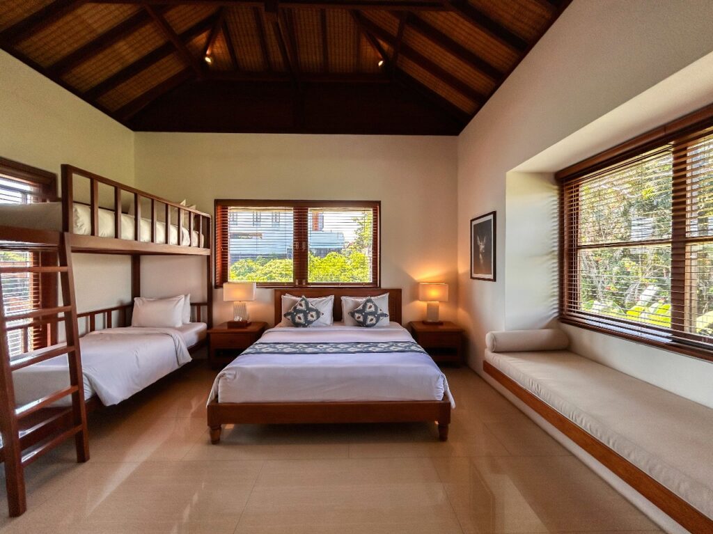The large luxury bedrooms are situated upstairs. They all feature beautiful interior design and furnishings with spacious high ceilings and subtle lighting. All bedrooms have AC and Wi-Fi and feature stylish Indonesian handcrafted hardwood beds with elegant luxury bedding. The garden facing bedrooms, feature large open balconies providing great views over the surrounding countryside and rice paddies. The bedroom is a very practical family room featuring both a king-sized bed and full-sized bunk beds. Each bedroom features contemporary en suite marble bathrooms with state-of-the-art fixtures and Fittings.