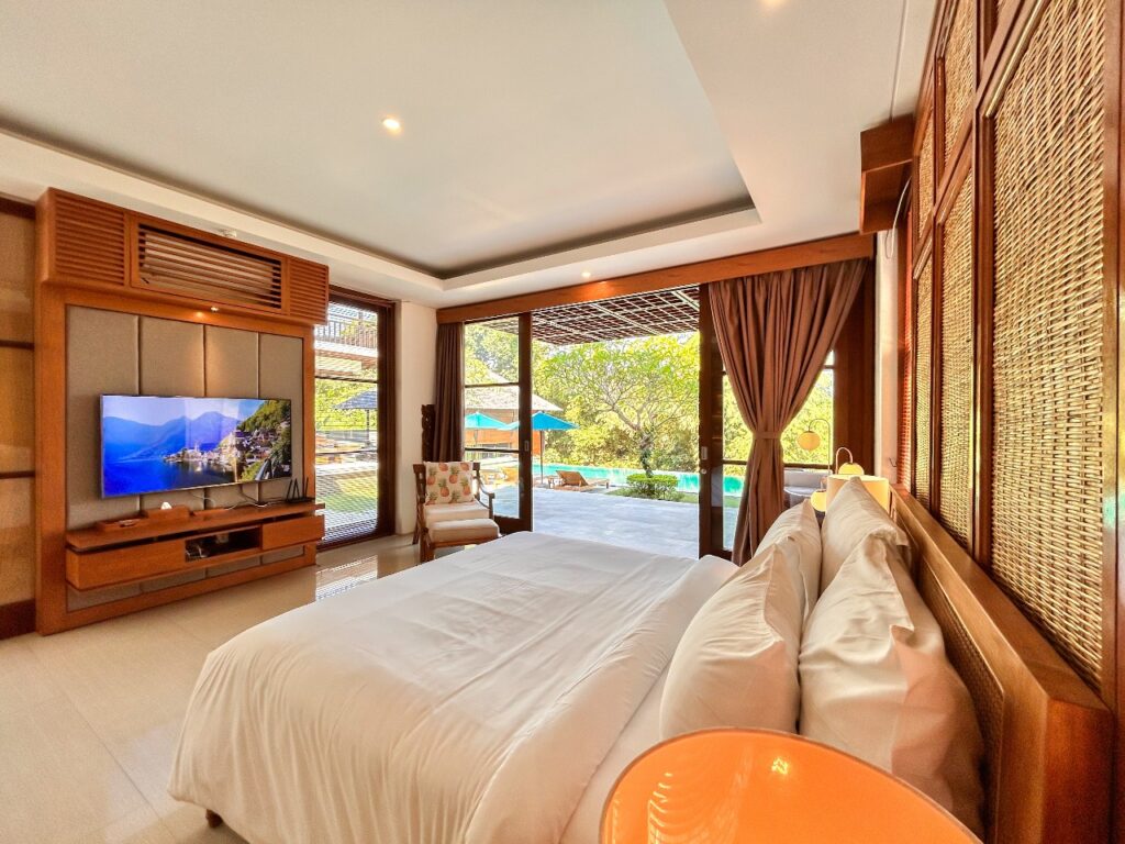 It is a two-story building. On the ground floor, it comes with a generous 16×5 meter infinity pool, a traditional pool Bale, a media room, a western standard open kitchen closing to a 10 people dining area. On the upper floor, there’re 3 bedrooms which consist of two spacious master bedrooms plus one family bedroom inclusive of 2 bunk beds which are welcomed by children, all ensuite. A total of 8 adults can be settled comfortably.
